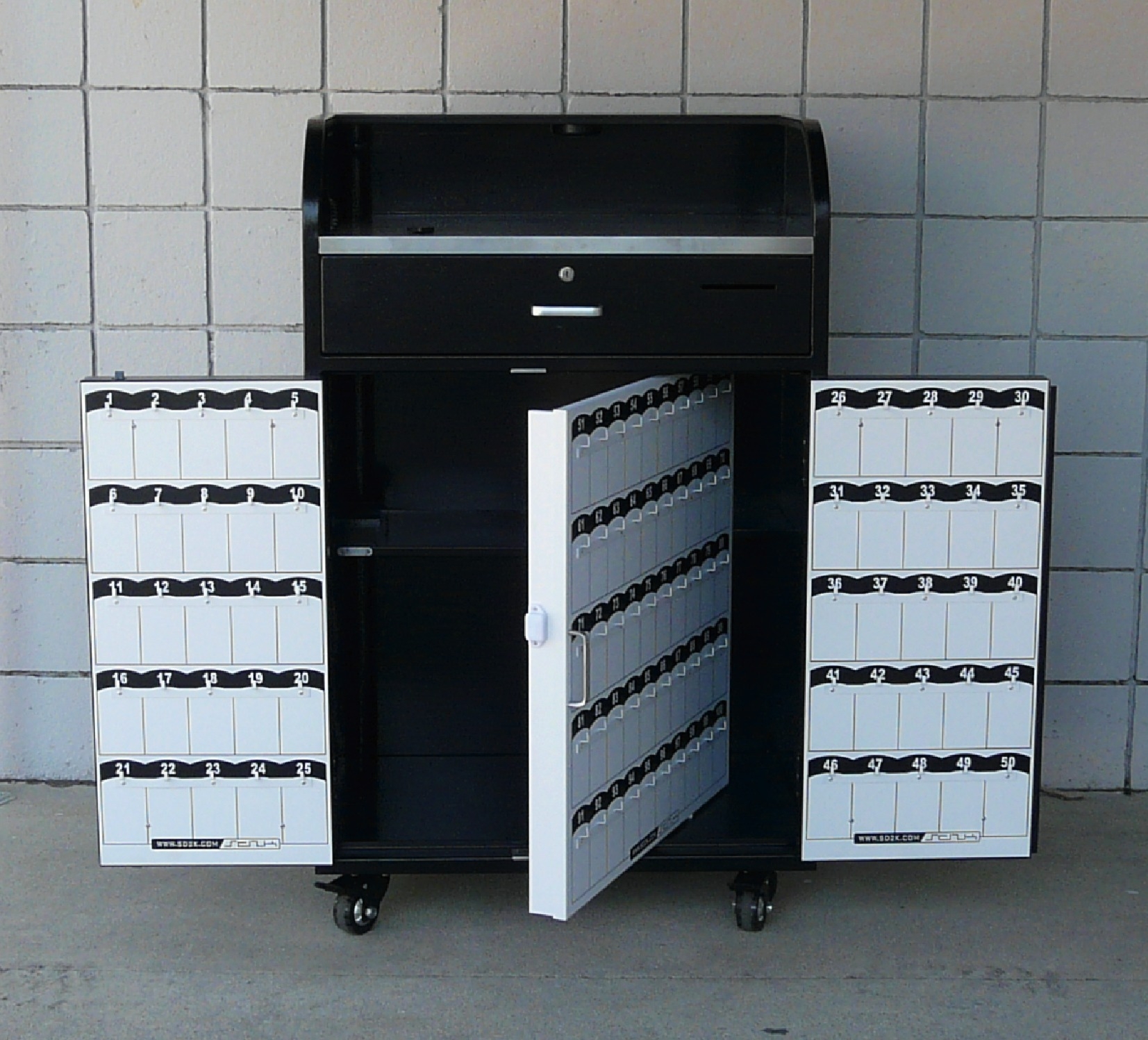 - This podium comes with an Elite locking system for the 150 hook key panel area. The Elite Locking system is a paddle handle look with slam action. As the panel door is pushed the cam rises then springs down behind the panel wall, automatically locking the door when closed